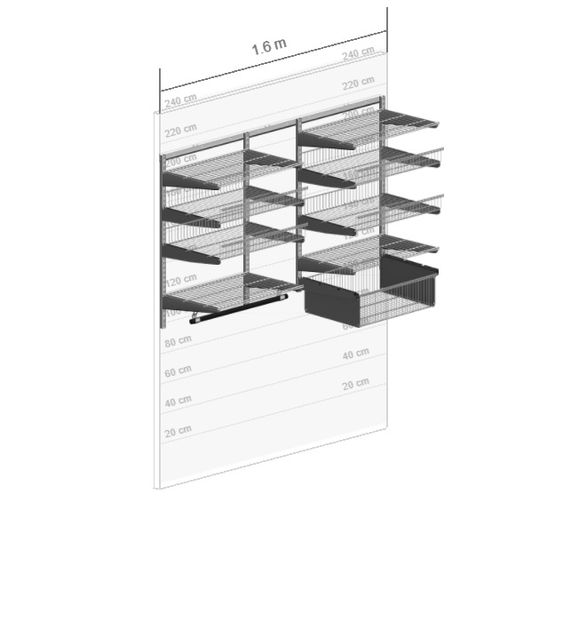 В комплект входят несущие рельсы и навесные направляющие, полки, штанги, аксессуары, крепежные элементы. Можно докупить множество дополнительных компонентов для гардеробной системы.