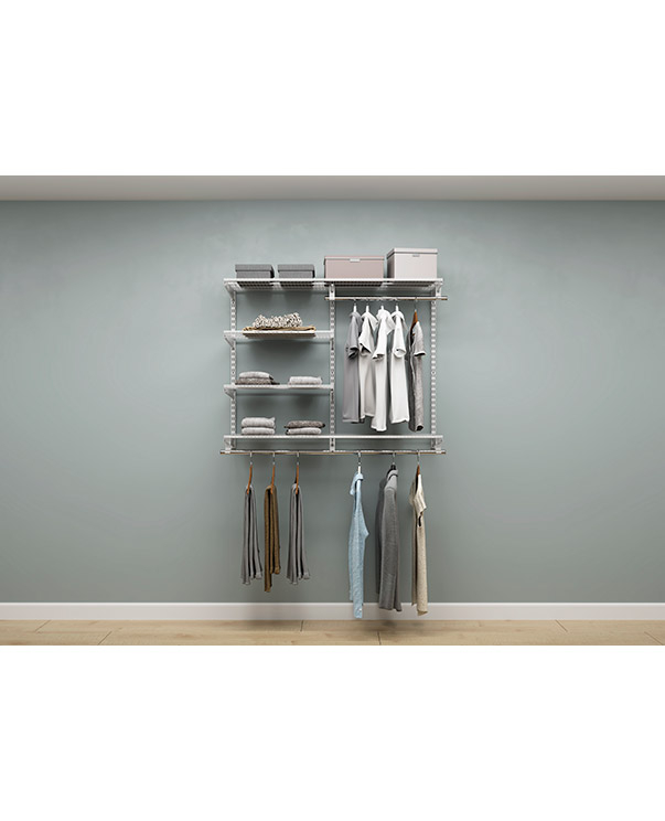 В комплект входят несущие рельсы и навесные направляющие, полки, штанги, аксессуары, крепежные элементы. Можно докупить множество дополнительных компонентов для гардеробной системы.