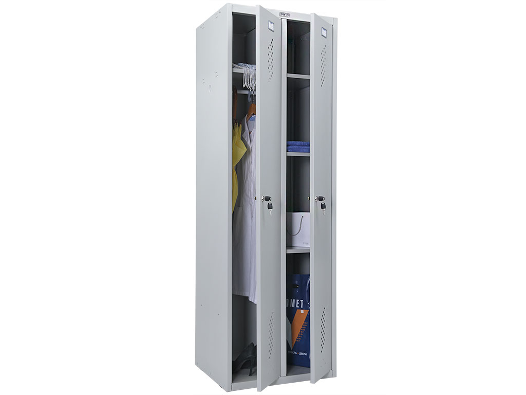 Шкаф металлический двухсекционный, предназначен для хранения сменной одежды и инвентаря.