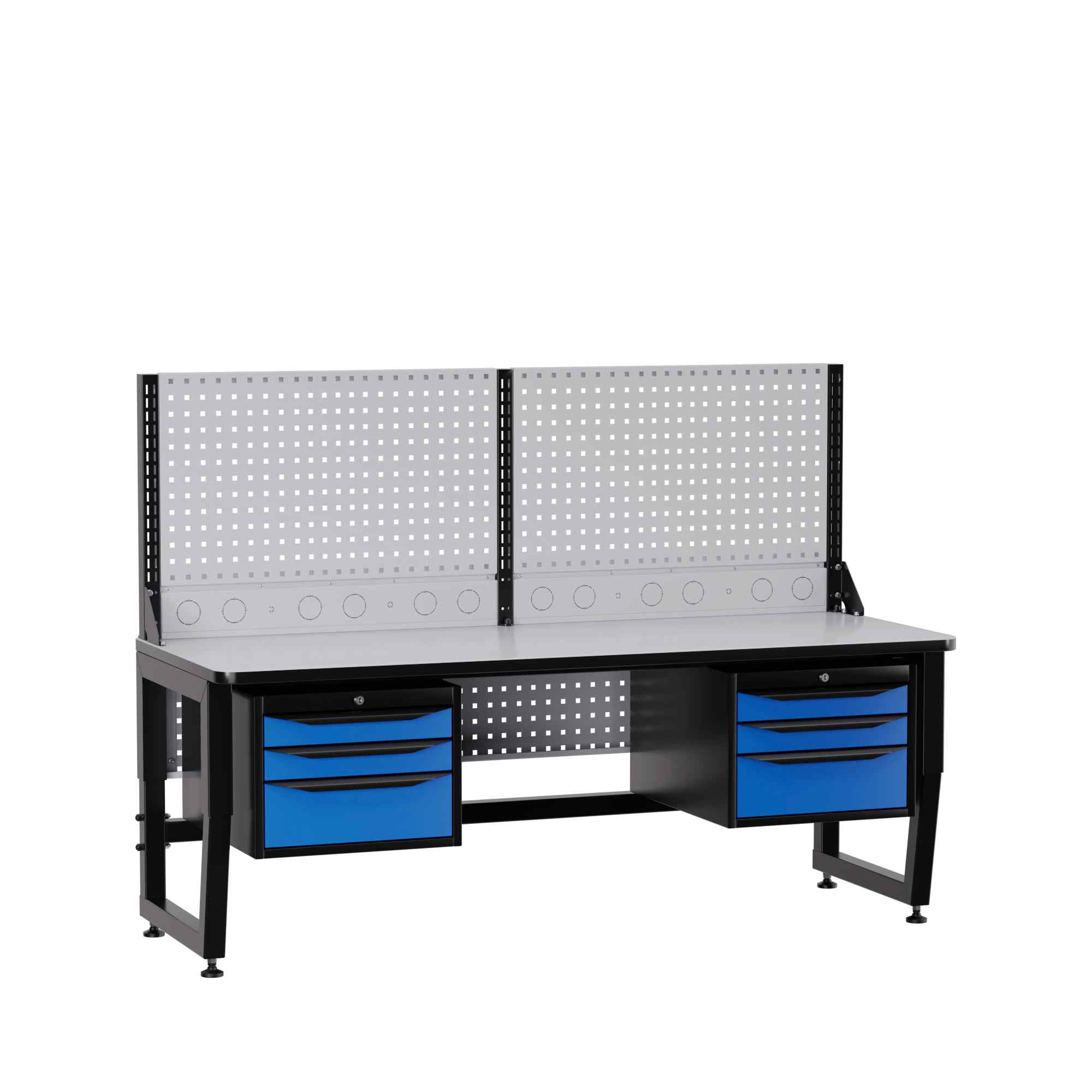 Несущая конструкция стола – это промышленный ESD каркас. Сочетание опорных, несущих и усиливающих элементов из металла, обеспечивают высокую надежность конструкции при интенсивной промышленной эксплуатации с распределенными нагрузками на рабочее место до 300 кг. Регулируемые опоры с возможностью плавной регулировки по высоте позволяют установить удобную высоту рабочей поверхности от 700мм до 850мм. Специальное ESD полимерное покрытие элементов каркаса с сопротивлением 1 МОм обеспечивают антистатические свойства изделия