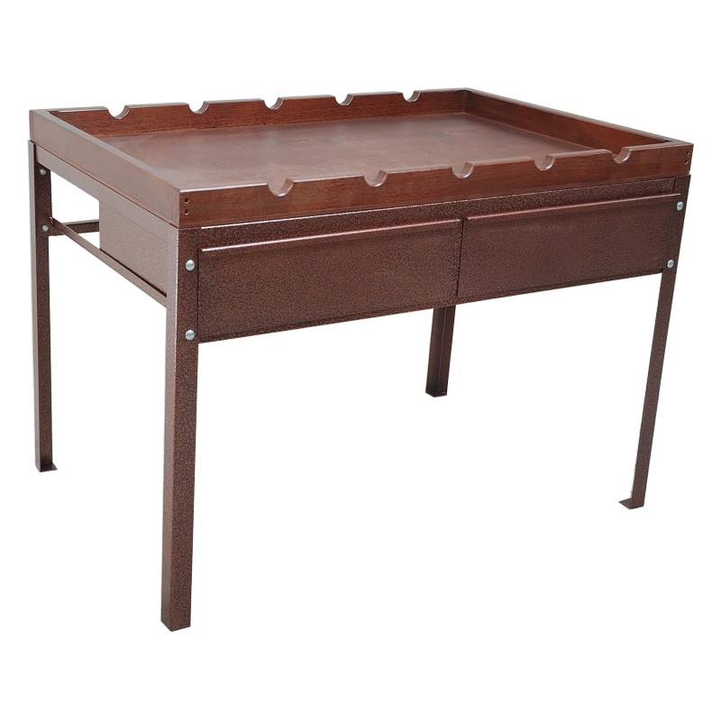 Стол предназначен для проведения регламентных работ с оружием. Столешница выполнена из влагостойкой фанеры или МДФ толщиной 10 мм и оборудована деревянной отбортовкой с пазами для комфортной работы с огнестрельным оружием. Для удобства пользователя данная модель стола оборудована двумя ящиками, для хранения вспомогательных инструментов.