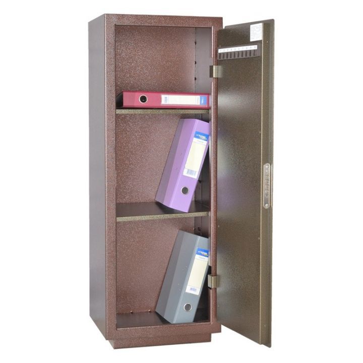 Сейф односекционный, оснащен двумя съемными полками. В двери установлен ключевой 8-ми сувальдный замок ЗАО «Про-Сам» г. Рязань или аналогичный замок другого производителя.