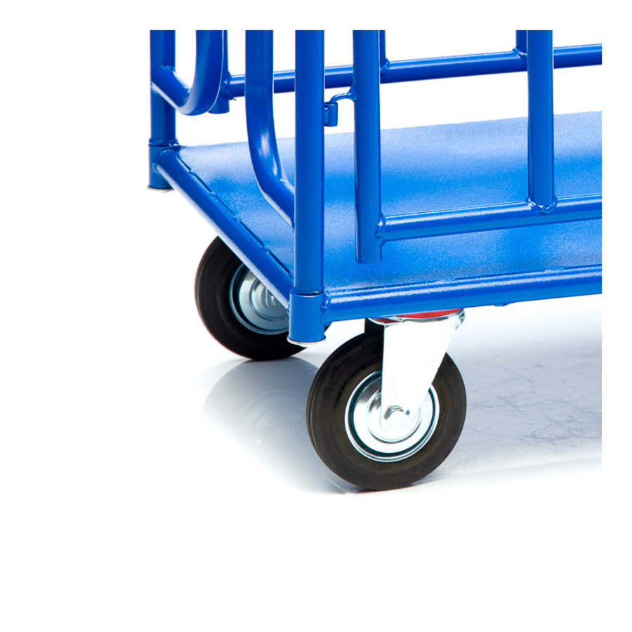 Платформенная 4-х колесная тележка с трубчатыми бортами КПО-500Т используется для транспортировки различных сборных грузов на оптовых базах и складах. Размер платформы 800х1200мм. Металлический борт защищает груз от падения и ударов, что позволяет перевозить хрупкие предметы и сборные грузы. Ручки и борта тележки снимается для удобства транспортировки и компактного хранения. Высота боковых бортов 400мм., высота борта от платформы 480мм., высота ручки 750мм., каркас платформы труба диаметром 28мм. Настил металлический лист толщиной 1,2мм. ручка труба диаметром 28мм., толщина 1,5мм. Каркас борта труба диаметром 25мм., толщина 1,5мм. Платформа имеет уникальную рельефную, полимерную, противоскользящую поверхность. Цвет синий, шагрень. Для легкого перемещения тележка КПО-500Т комплектуется 2 поворотными и 2 неповоротными колесами, изготовленными из высококачественной литой резины.