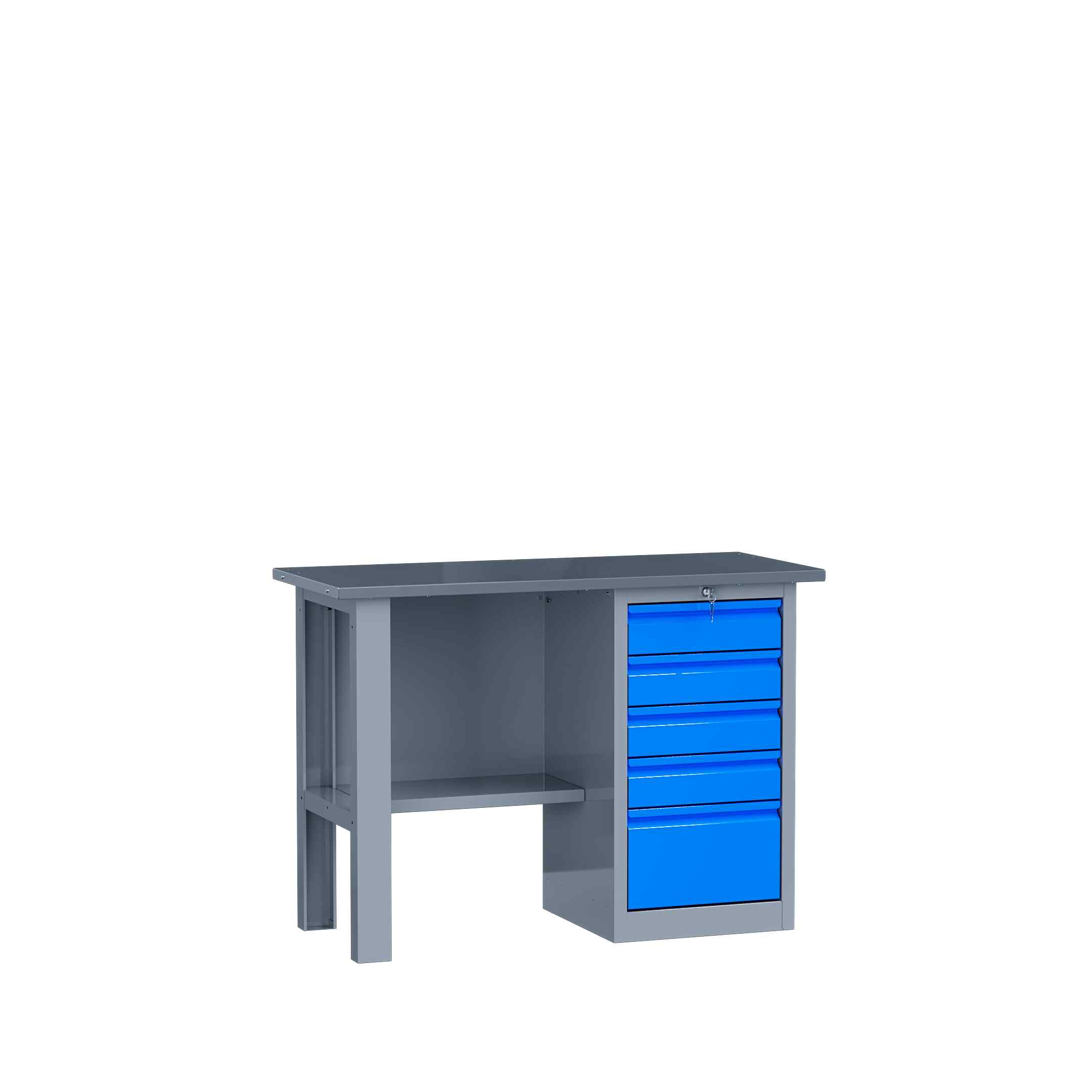 Верстак создаст для вас удобное рабочее место: в комплектации имеется одна большая тумба, нижняя полка. Тумба имеет пять ящиков, которые используются для удобного складирования инструментов.