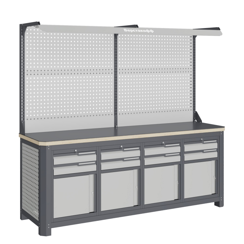 Экран (перфорированная панель) верстака выполнен с квадратной перфорацией 12х12 мм с шагом 38 мм для установки крючков, держателей и других аксессуаров. Экран крепятся к столешнице с помощью специальных кронштейнов. Максимальная масса груза, равномерно распределенного по поверхности экрана, составляет 71 кг.