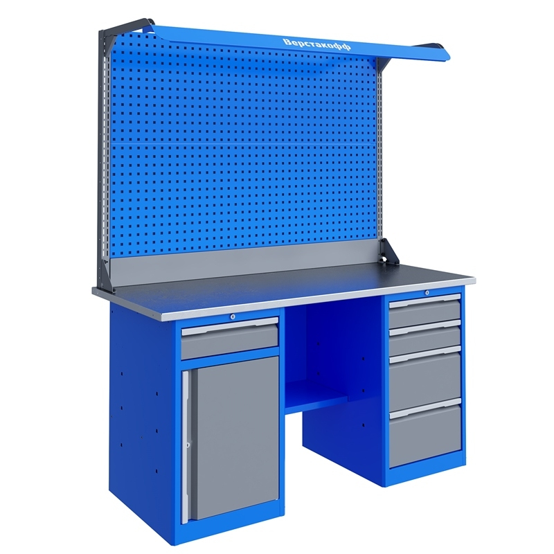 Верстак серии Technic 161.48.1-2F состоит из столешницы шириной 1596 мм, тумбы P4 с двумя малыми и двумя большими ящиками, тумбы P8 с малым ящиком и отделением с дверью, полки-стенки, двойного экрана с кронштейнами и комплекта освещения.