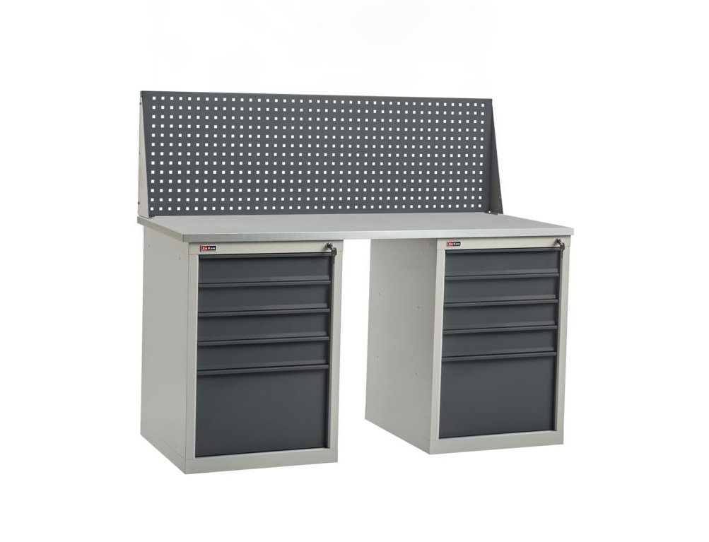 Столешница установлена на опору и инструментальную тумбу ВЛ-015 с 5 выдвижными ящиками. Максимальная динамическая нагрузка на ящик тумбы — 40 кг. Предельно возможная статическая нагрузка на ящик — 80 кг. Еще верстак комплектуется подвесной тумбой ВЛ-003 с 3 выдвижными ящиками.