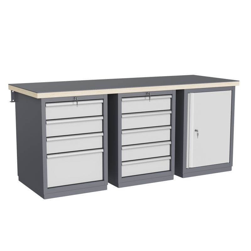 Тумбы и опоры верстаков выполнены из профилированной холоднокатаной стали и имеют сварную конструкцию. Возможна установка любых сочетаний тумб с различным количеством выдвижных ящиков, а также с дверцей и полками. Между тумбами и опорами возможна установка полки-стенки. На каждой ручке ящика и двери закреплен специальный алюминиевый профиль с отделением для установки маркировки. На тумбы с выдвижными ящиками установлена система антиопрокидывания, которая ограничивает выдвижение остальных ящиков тумбы, если один из ящиков выдвинут. Ящики снабжены специальными усиленными шариковыми направляющими. Тумбы снабжены центральной системой запирания.