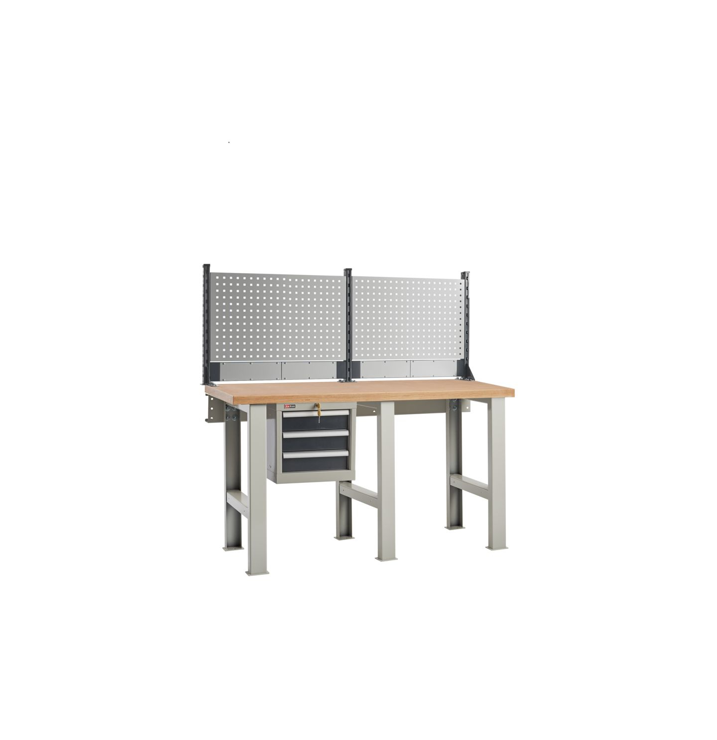 Металлические элементы верстаков окрашены эпоксидной порошковой краской, устойчивой к механическим воздействиям и агрессивным жидкостям. Ящики, дверцы тумб и стойки экрана – цвет антрацитово-серый RAL 7016, остальные элементы – цвет серый RAL 7038.